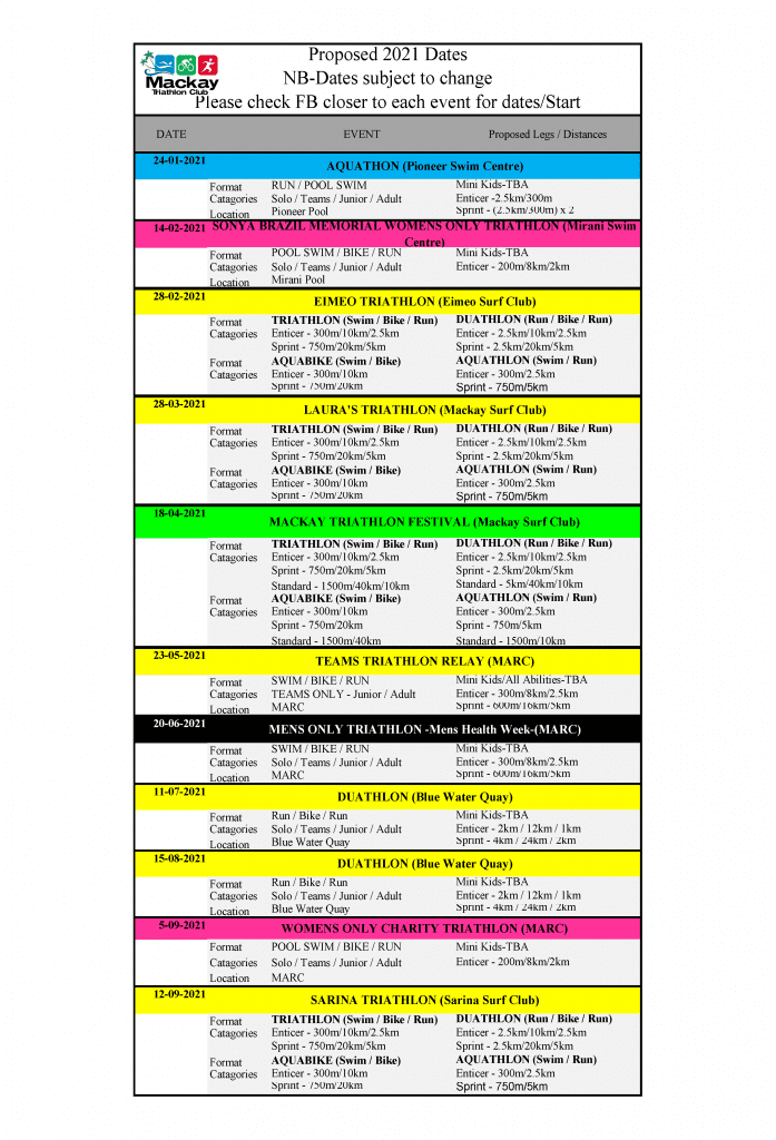 Mackay Triathlon Club offers several race distances to cater for all levels. Most races also include duathlon, Aquathlon and Aquabike option race formats to cater for everyone.. Distances are approximate and may change slightly depending on available course and conditions…